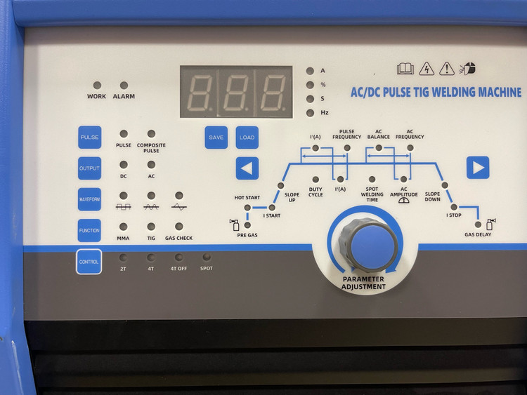 - دارای سیستم دقیق تنظیم برق AC برای جوشکاری آلومینیوم (AC-AMPLITUDE)-(AC-FQ)-(AC-AMPLITUDE)